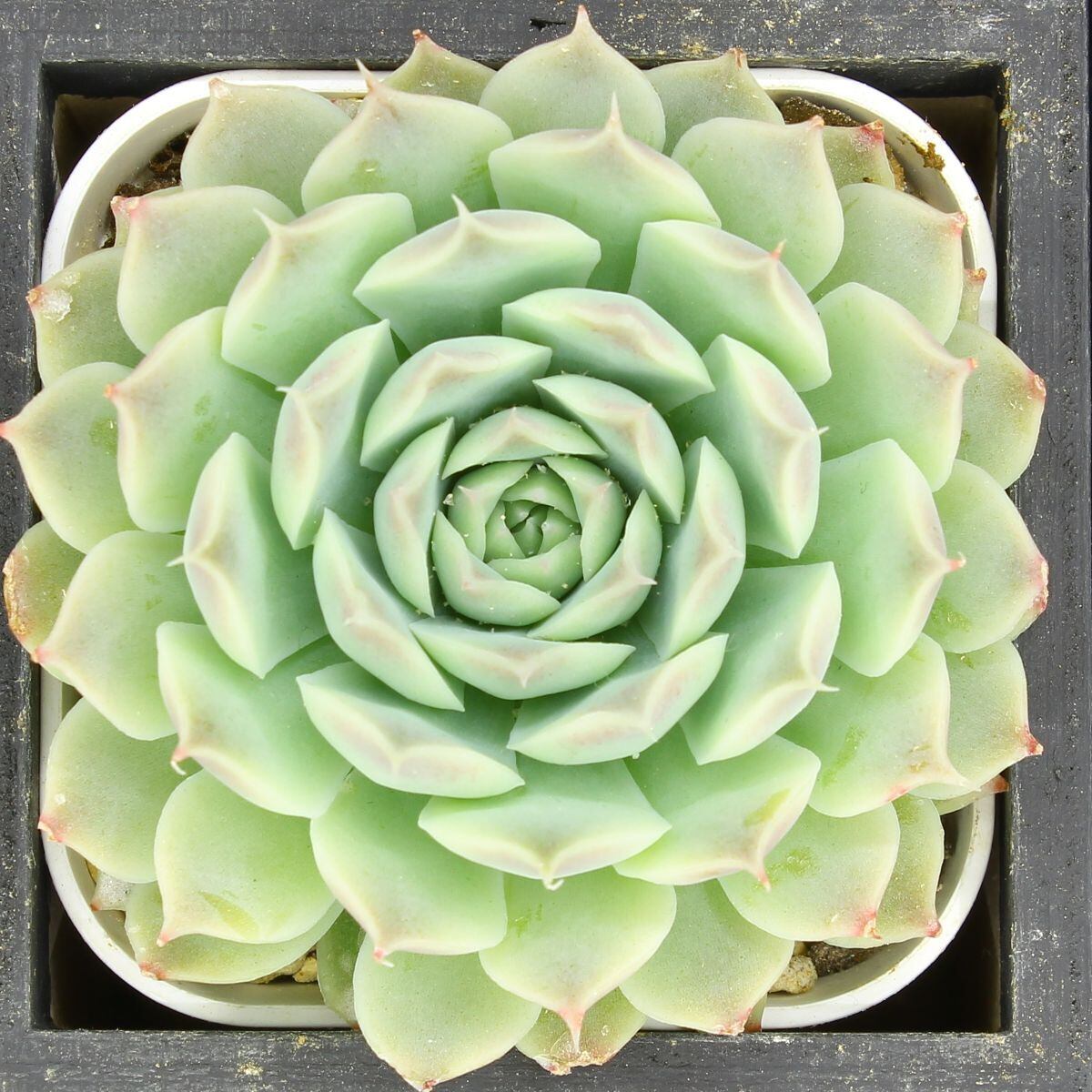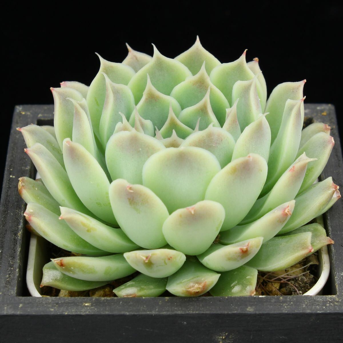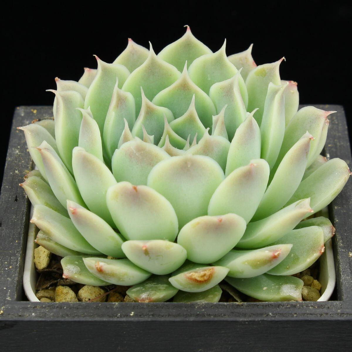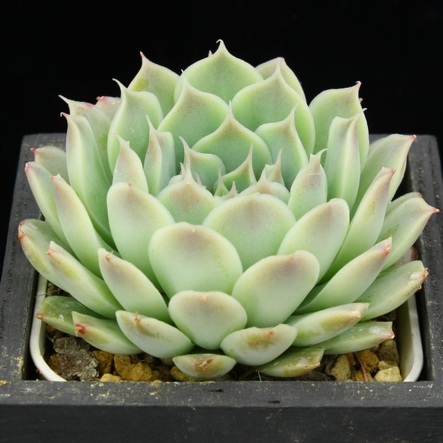 透き通った外跳ねの葉が特徴のヒアリナ。特にラパスは有名です。実生では、細葉や丸葉、色濃いめ、薄いめなど様々な顔違いがあります。ので、お気に入りの一株を選んでください。本種について、以前は”ヒアリナ”という種小名が用いられていましたが、現在はシムランスのシノニム扱いとなっています。Echeveria simulans ,San Luis de La Pazとするのが正しいのかもしれませんが、ここでは種子輸入時点の名称を使用します。
