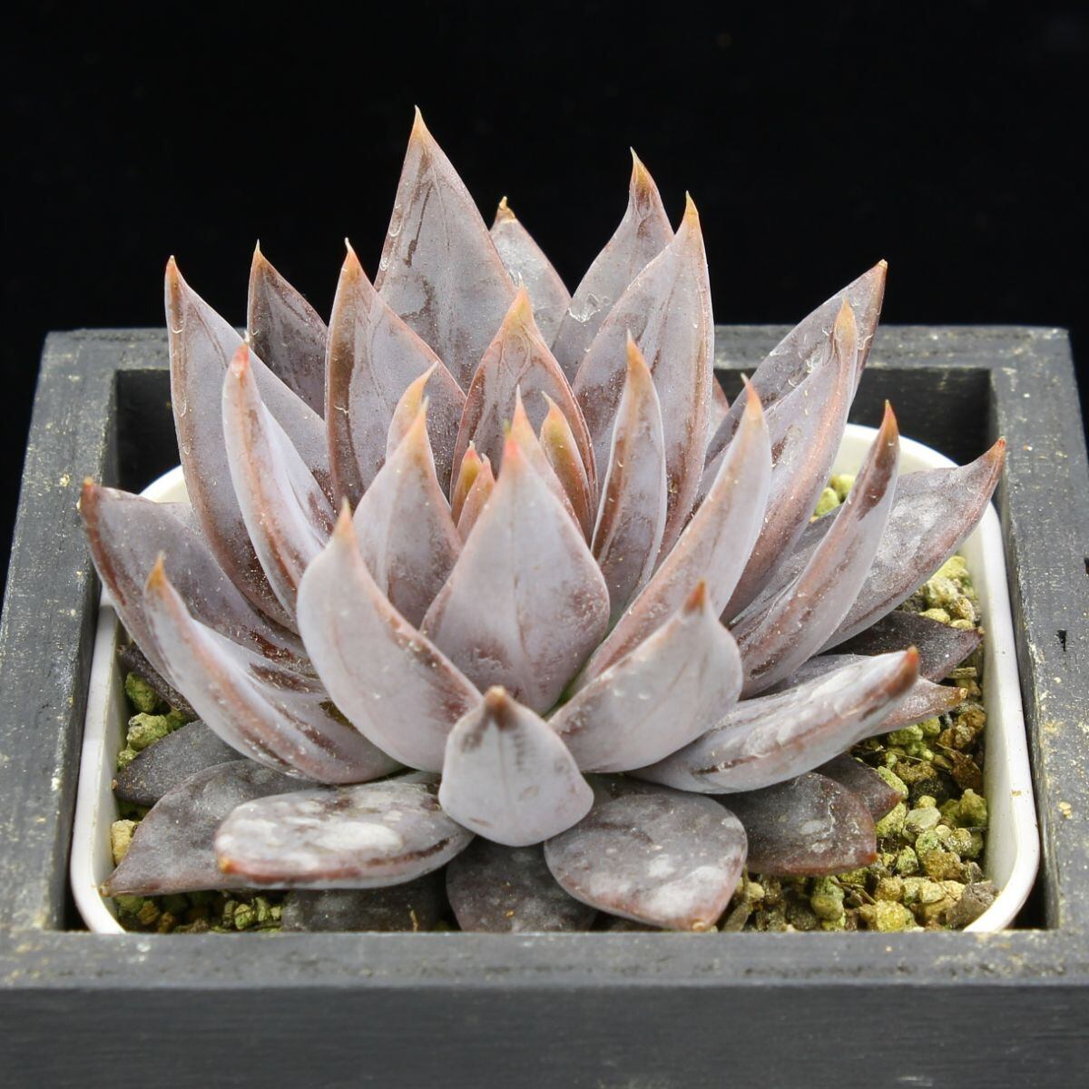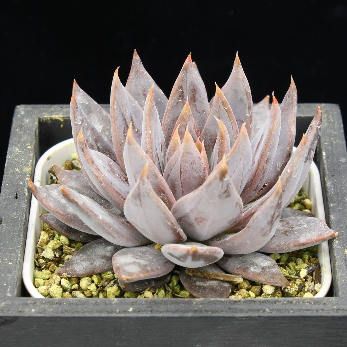 シュッとして細長い葉の先に白い爪をつける原種エケベリア。全身が淡い紫色になり、美しいファセットライン(ウォーターマーク)も入ります。