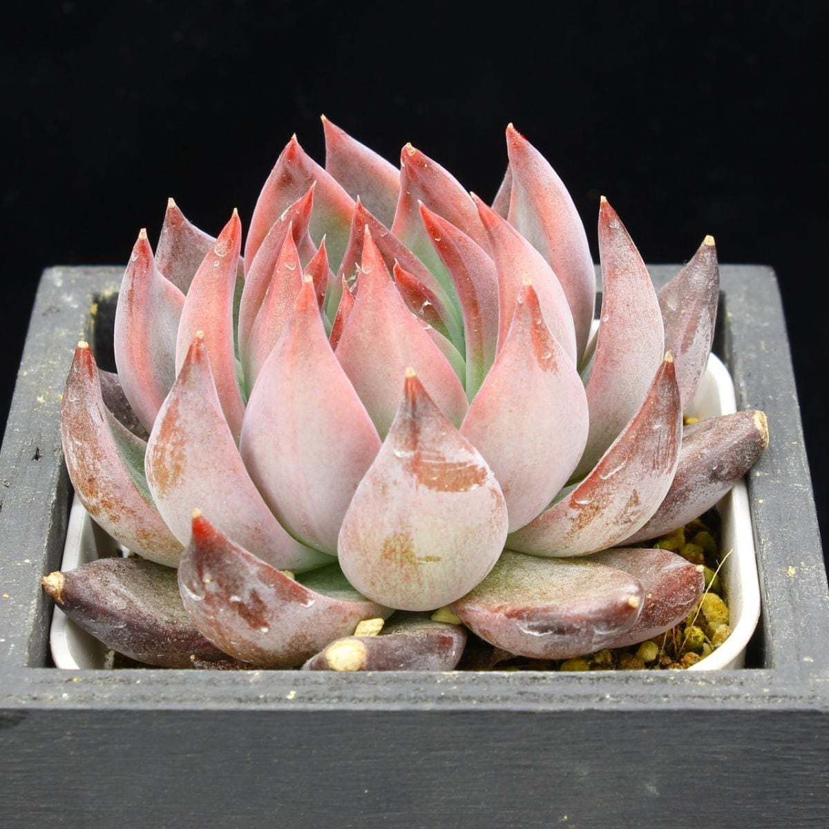 コロラータの人気品種、アテマハックです。特徴は何といっても紫色に近い深い紅葉。アテマハック独特の色合いに魅了されること間違いなし。葉先までぽってりとしたイメージの強いコロラータ系のエケベリアですが、アテマハックの葉は少し変わっていて、滴形に葉先がシュッと伸びてきます。「かわいい」より「かっこいい」という表現が似合う一味違ったコロラータです。
