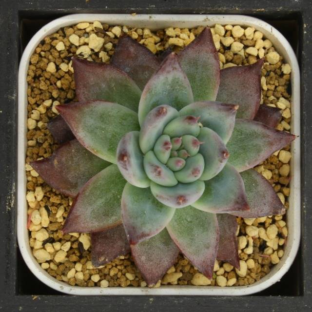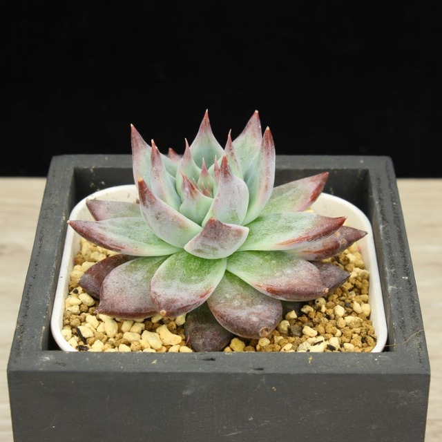 コロラータの人気品種、アテマハックです。特徴は何といっても紫色に近い深い紅葉。アテマハック独特の色合いに魅了されること間違いなし。葉先までぽってりとしたイメージの強いコロラータ系のエケベリアですが、アテマハックの葉は少し変わっていて、滴形に葉先がシュッと伸びてきます。「かわいい」より「かっこいい」という表現が似合う一味違ったコロラータです。